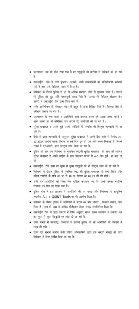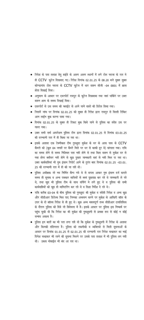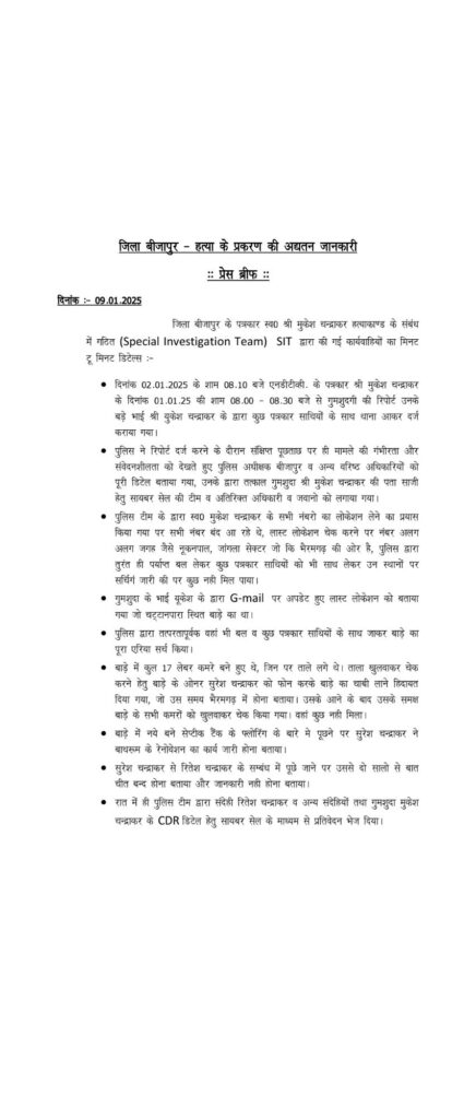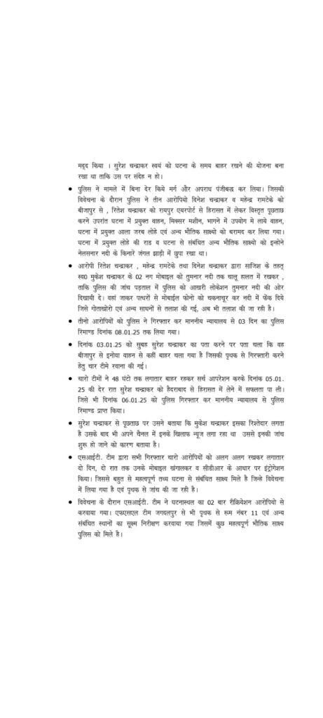 एसआईटी ने किये बड़े खुलासे, पत्रकार मुकेश चंद्राकर हत्याकांड के आरोपियों के अपराध को प्रमाणित करने साक्ष्य संकलन में पुलिस ने झोंकी ताकत..