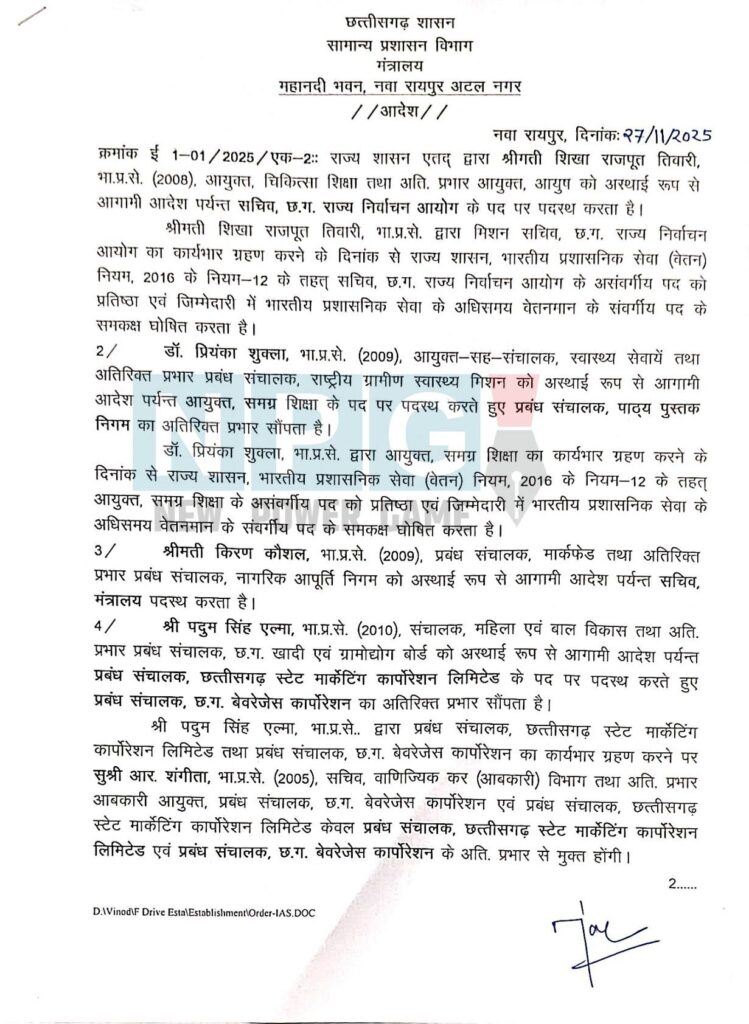 शिखा राजपूत तिवारी,भा.प्र.से. (2008), आयुक्त्त, चिकित्सा शिक्षा तथा अति. प्रभार आयुक्त, आयुष को अस्थाई रूप से आगामी आदेश पर्यन्त सचिव, छ.ग. राज्य निर्वाचन आयोग के पद पर पदस्थ करता है।