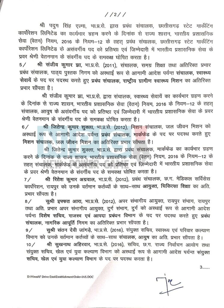 संतन देवी जांगड़े, भा.प्र.से. (2016), संयुक्त सचिव, स्वास्थ्य एवं परिवार कल्याण विभाग को उनके वर्तमान कर्तव्यों के साथ-साथ संचालक, आयुष का अति. प्रभार सौंपता है।