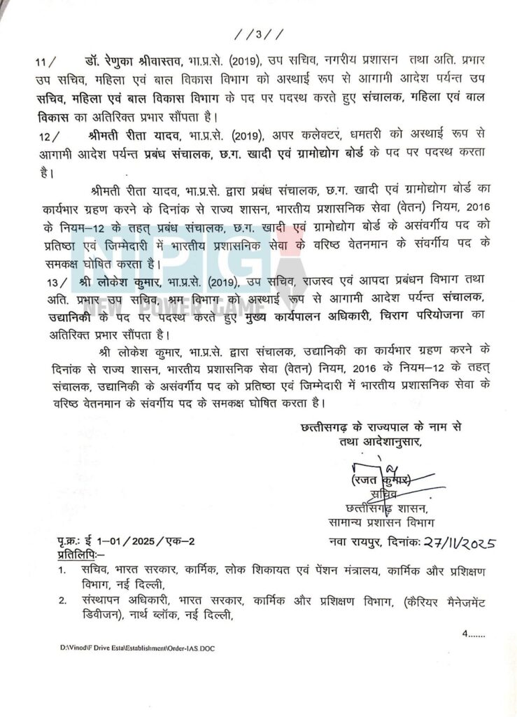 रीता यादव, भा.प्र.से. (2019), अपर कलेक्टर, धमतरी को अस्थाई रूप से आगामी आदेश पर्यन्त प्रबंध संचालक, छ.ग. खादी एवं ग्रामोद्योग बोर्ड के पद पर पदस्थ करता है।