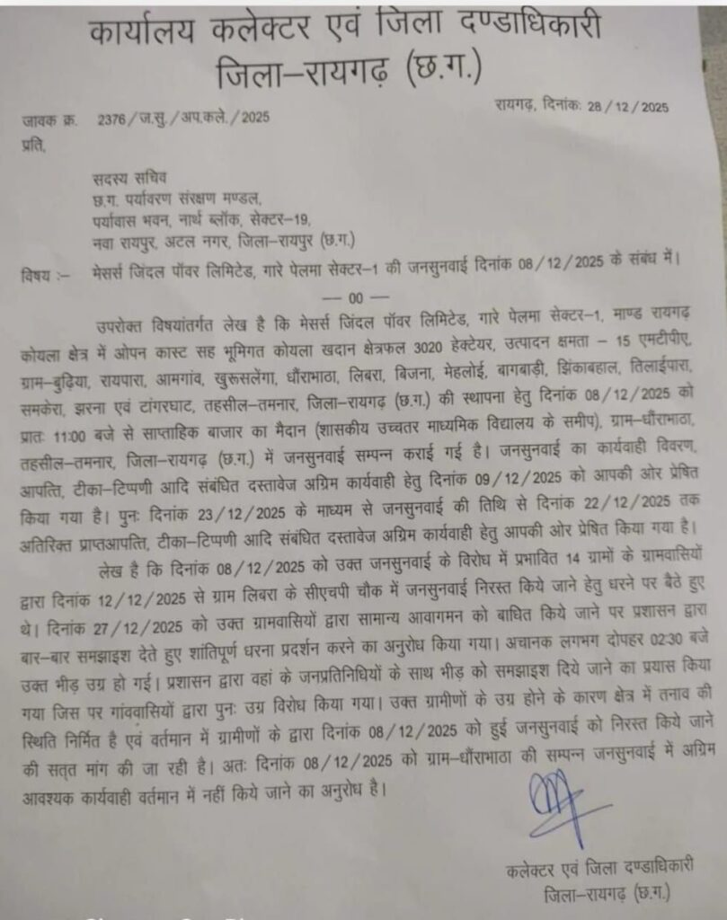 28 दिसम्बर को रायगढ़ कलेक्टर के द्वारा राज्य पर्यावरण संरक्षण मंडल को पत्र भेजा गया है। जिसमें इस जनसुनवाई की पूरी रिपोर्ट और वस्तु स्थिति से अवगत कराया गया है और जनसुनवाई की प्रक्रिया को होल्ड करने की बात कही गई है। लेकिन जिंदल पावर द्वारा प्रेस रिलीज में बताया गया है कि कलेक्टर रायगढ़ के द्वारा दिनांक 28 दिसंबर 2025 को उक्त जनसुनवाई को निरस्त करने बाबत पत्र लिखा गया..?
